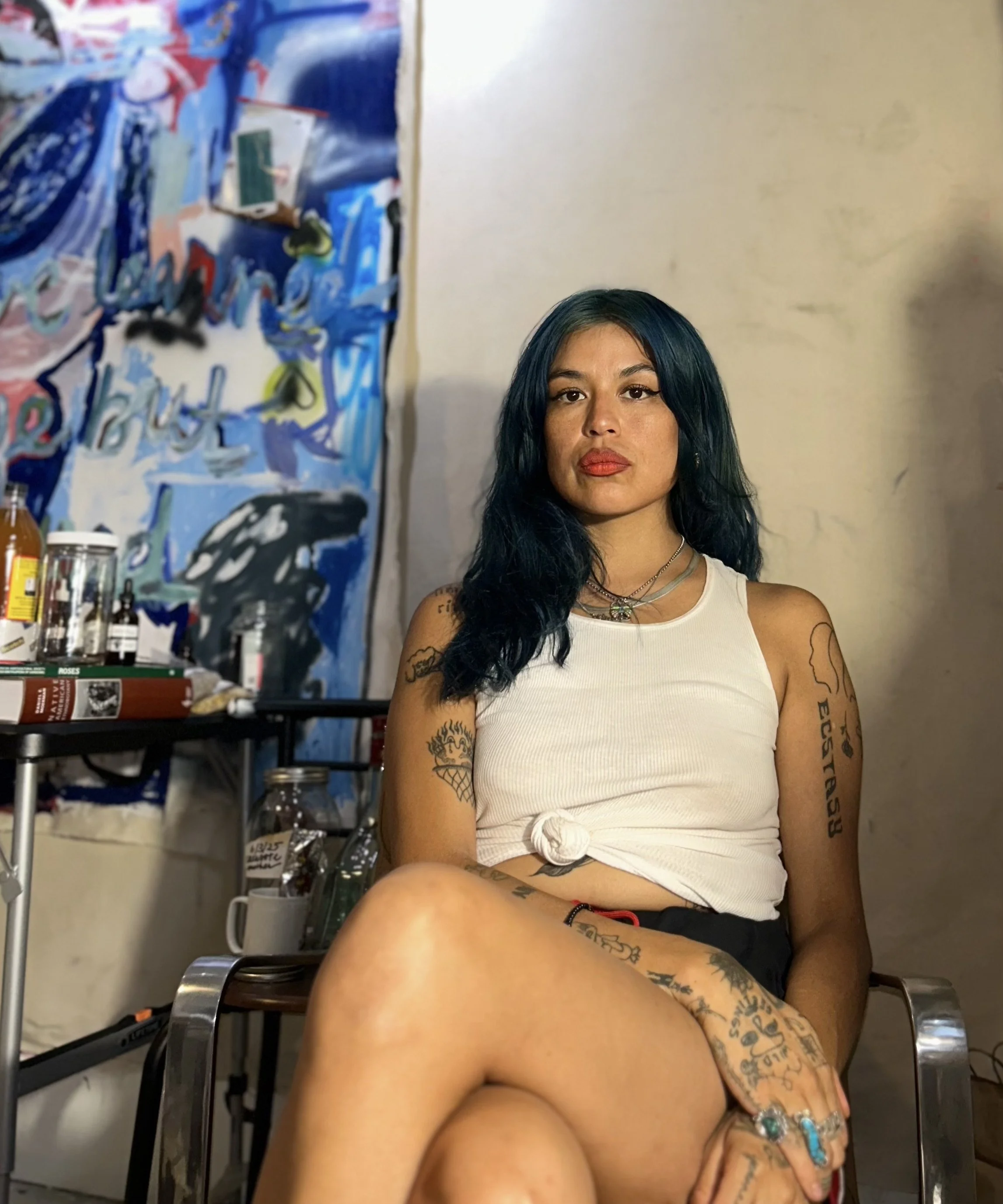 Grace Rosario Perkins (b. 1986, Santa Fe, NM, lives and works in Brooklyn) is a self-taught Diné/Akimel O’odham painter interested in disassembling her personal narrative through layered words, objects, colors, and signs.